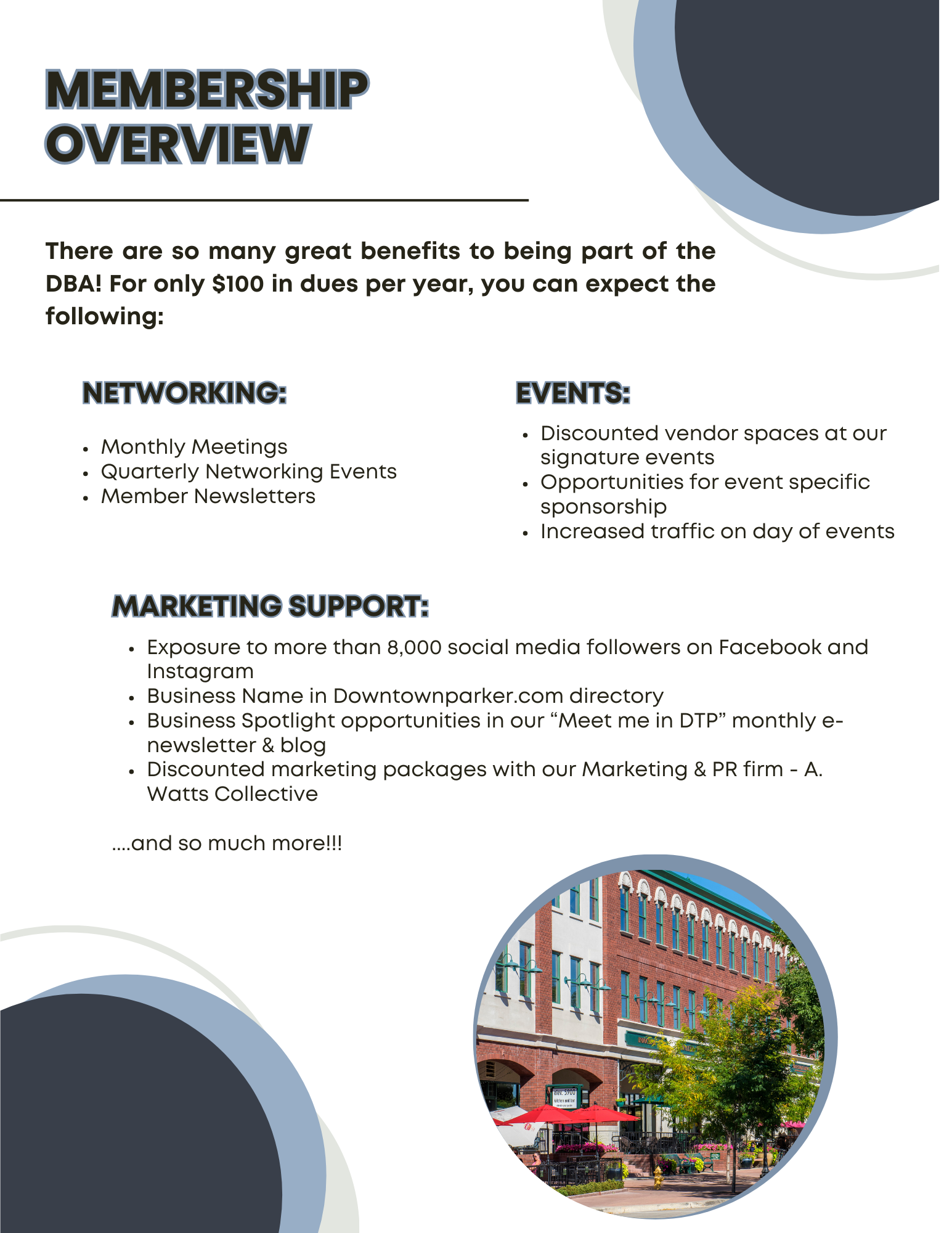 Downtown Parker is run by the Downtown Business Alliance of Parker (a.k.a. “The DBA”) The DBA is a 501(c)6 nonprofit, membership-based organization led by business owners, managers, and supporters who believe Downtown Parker is something special. We exist to promote our businesses, activate our streets, and invite Parker residents—and the entire Denver Metro area to experience our downtown.